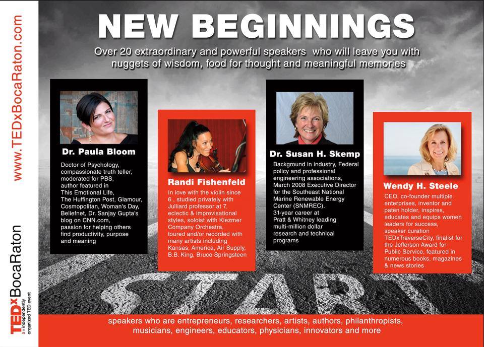 New Beginnings happen every second. Each day is a new start, with a fresh outlook on ideas to share. TEDx Boca Raton wants to be the catalyst of innovation and open your mind up to the possibility of something new.