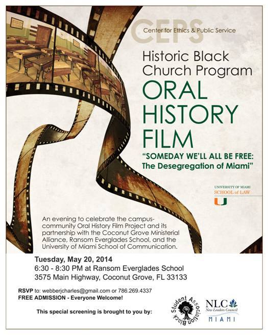 Join the Oral History Film Project and it’s partners Tuesday, May 20, 2014, 6:30 PM at Ransom Everglades School, Lewis Auditorium for a special screening of the Historic Black Church Program Oral History Documentary on the Desegregation of Miami.This documentary film was produced by University of Miami Law Students at the UM Center for Ethics and Public Service and Ransom Everglades School UMCEPS student correspondents.