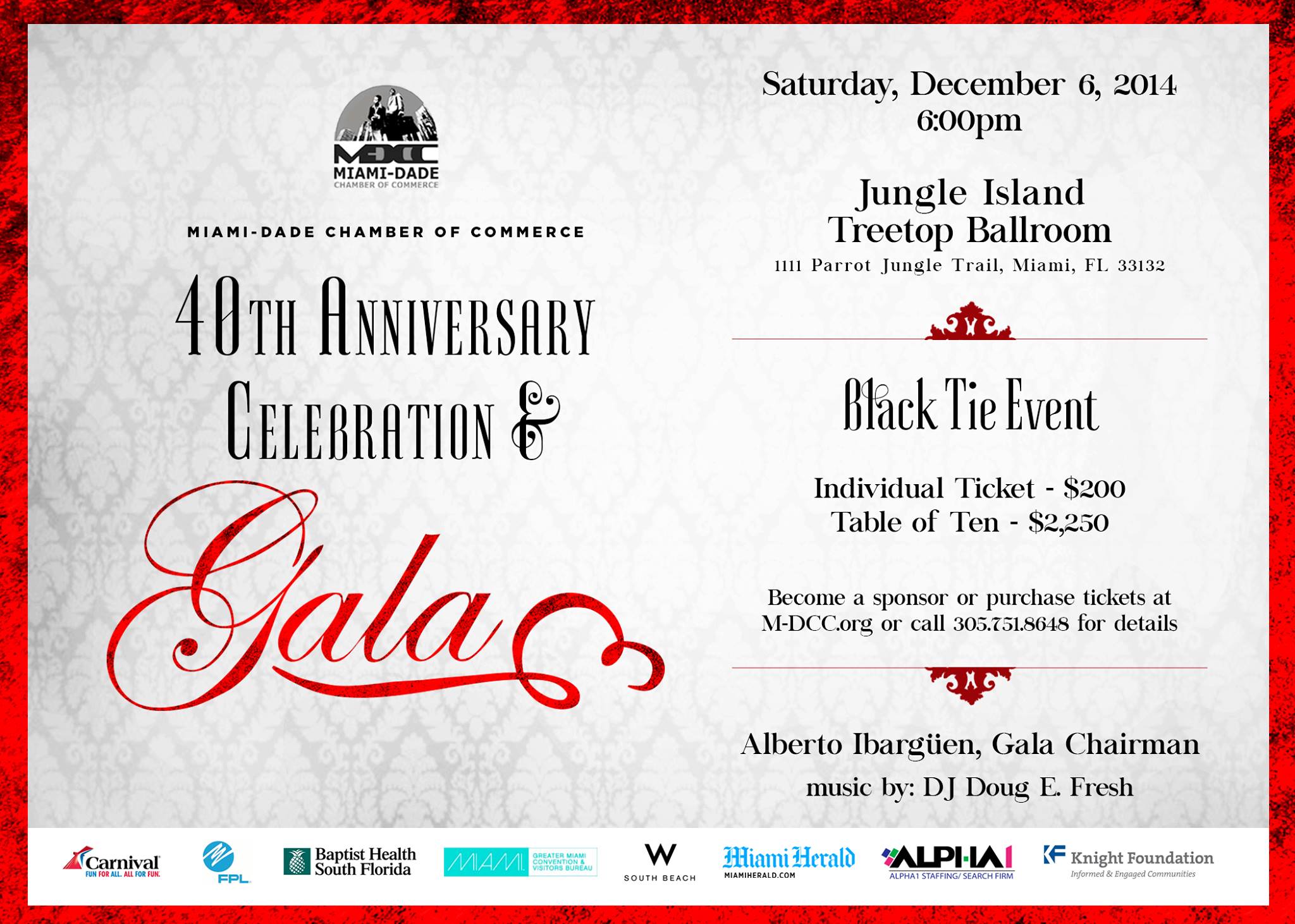 MIAMI, FL, October 27, 2014 — The Miami-Dade Chamber of Commerce (M-DCC) will host an elegant black-tie gala to celebrate its 40th Anniversary and you are invited to attend. The Ruby inspired Gala will be held on Saturday, December 6, 2014 at Jungle Island Tree Top Ballroom, 1111 Parrott Jungle Trail, Miami, Florida 33132. The gala begins with a cocktail reception at 6:00 pm. The gala always attracts an esteemed group of notable civic, business and community influencers. This year’s gala chairman is Alberto Ibargüen, President and CEO of the John S. and James L. Knight Foundation. Music will be provided by legendary Doug E. Fresh.